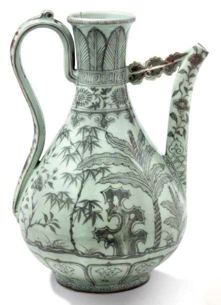 Théière en porcelaine de style yuan à décor émaillé gris à l'imitation des premiers rouges de fer sous couverte. La panse à décor de bambous, bananiers, pivoines et rochers, soulignés au niveau du col et du pied par des feuilles de lotus stylisées, des feuilles de bananiers et des rinceaux de chrysanthèmes. L'anse et le col ornés de rinceaux.