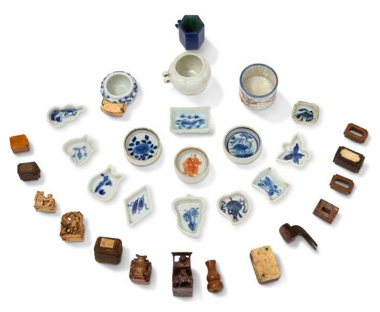 Ensemble d'éléments pour cage à oiseaux comprenant 17 mangeoirs en porcelaine bleu-blanc et polychrome de formes et décors divers, et 14 petits décors en bois décoratifs en bois sculpté.