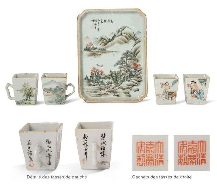 Service en porcelaine comprenant quatre tasses à paroi droite évasée et un petit plateau rectangulaire à angles lobés | le plateau et deux tasses à décor en émaux polychromes d'un paysage lacustre, les deux autres ornées de jeunes femmes et arbustes. Trois des tasses àvec anses en forme de bambous.