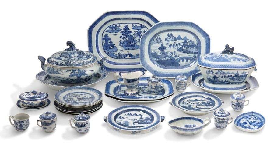 Un bel ensemble de 54 pièces de commande pour le marché européen, en porcelaine bleu-blanc émaillée sous couverte à décor de cité lacustre comprenant :