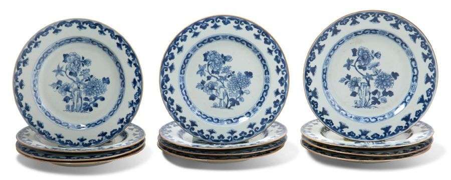 Ensemble de douze assiettes en porcelaine, à décor en bleu sous couverte de pivoines et chrysanthèmes près de rochers, le marli orné de fleurs et rinceaux, le bord à motif de pendentifs.