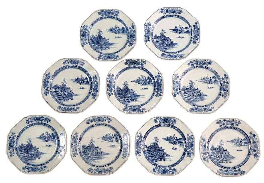 Ensemble de neuf assiettes octogonales à bords polylobés en porcelaine bleu blanc, à décor d'un pavillon sur les berges d'un fleuve sur lequel se trouve un pêcheur, les bords ornés de pivoines et lotus.