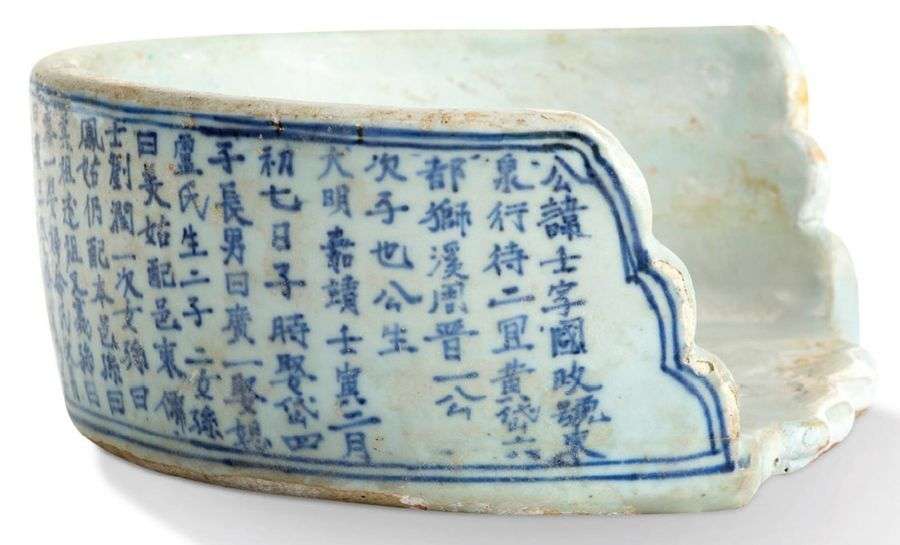 Présentoir à offrandes en porcelaine bleu-blanc, la paroi externe inscrite sur toute sa surface d'une généalogie d'ancêtres portant les dates 1542 et 1620.
