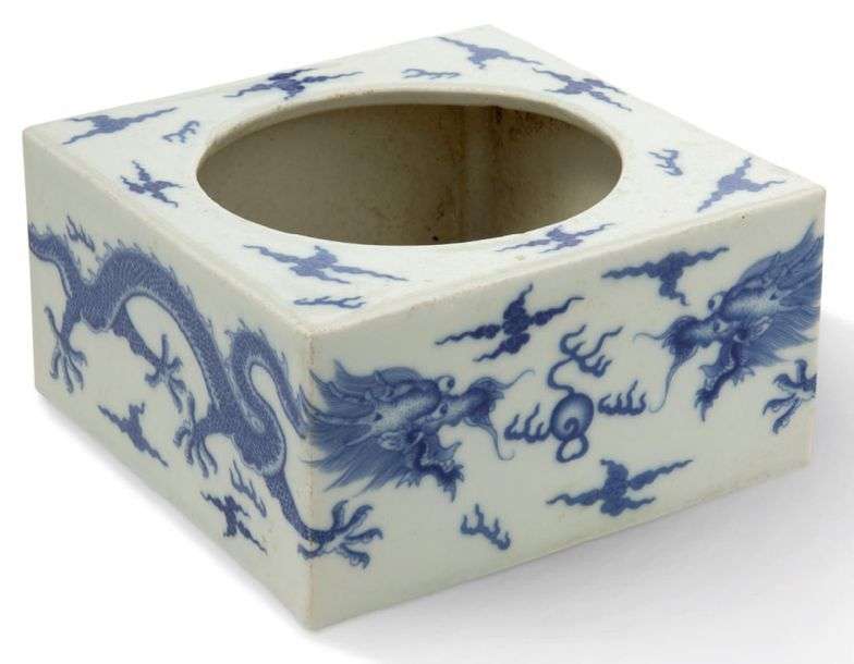 Récipient de forme carrée en porcelaine bleu-blanc à ouverture circulaire, à décor de deux dragons à cinq griffes s'affrontant autour de la perle sacrée parmi des nuages stylisés.