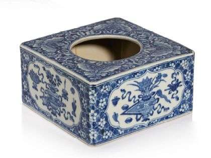 Boîte carrée en porcelaine bleu-blanc, avec un dessus percé d'une ouverture circulaire, à décor d'objets mobiliers, de papillons et fleurs.