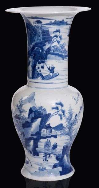Vase yenyen en porcelaine, à décor en bleu sous couverte d'un village lacustre parmi des pics montagneux, animé d'embarcations et promeneurs.