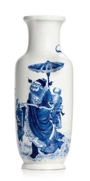 Vase balustre en porcelaine, à décor en bleu sous couverte représentant Zhongkui accompagné de serviteurs, tenant un sceptre ruyi.