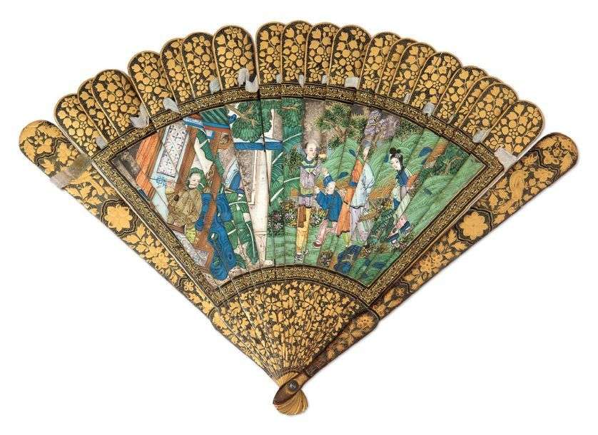 Éventail à brins en bois laqué et motifs de fleurs dorées, à décor peint en polychromie, d'un côté de de jeunes femmes jouant au go, et sur l'autre face de personnages dans un jardin.