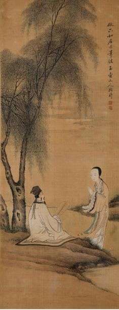 Peinture verticale sur soie, à l'encre et légère polychromie représentant un couple de lettrés se reposant devant un lac au pied d'un saule pleureur. Avec une inscription : «Dans le goût de Tang Yin» et porte une signature apocryphe de Gai Qi (1774-1829). Deux cachets apocryphes.