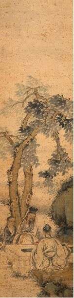 Peinture verticale à l'encre et couleurs légères sur papier, représentant une scène musicale où un lettré et son disciple écoutent sous un platane un maître de guqin jouant de dos. Cette composition symbolise l'harmonie, par une compréhension musicale mutuelle.