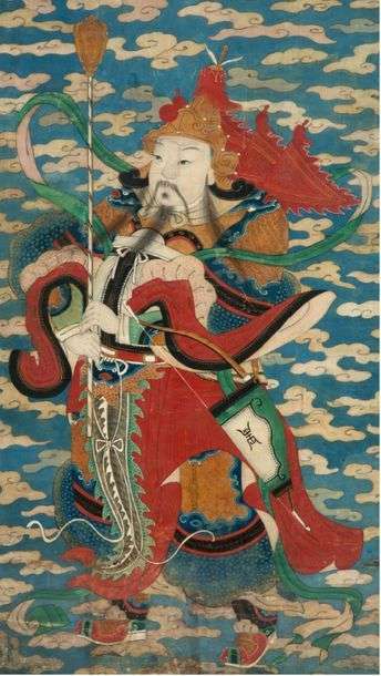 Peinture polychrome sur papier avec traces de dorures, représentant Guandi, le dieu de la guerre, dans son armure, la main gauche tenant une longue masse d'arme en pleine ascension parmi des nuages stylisés.