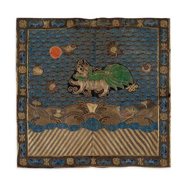 Carré de mandarin buzi en soie chocolat brodée aux fils verts et dorés d'un Xie Zhai, créature mythique symbole de justice, regardant vers un soleil rehaussé de perles de corail, parmi nuages bleus et motifs auspicieux, au-dessus de flots et de lishui aux fils dorés | le pourtour souligné d'une bordure alternant chauves-souris et caractères shou stylisés. Ce symbole était porté par les censeurs, mandarins s'assurant de l'intégrité des autres mandarins.