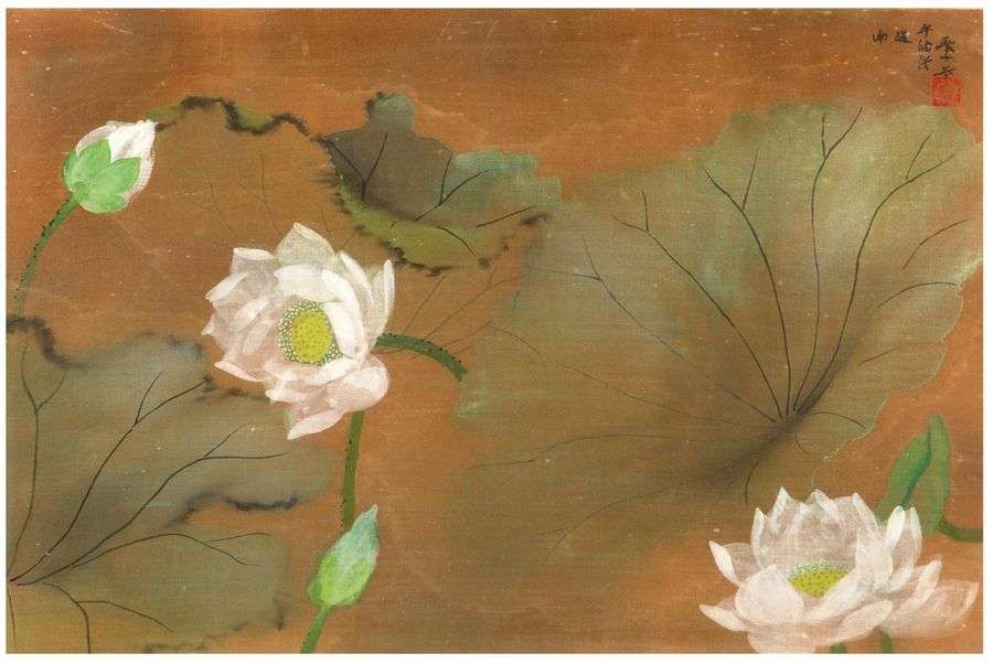Aquarelle sur soie, représentant des branches de lotus blanc.