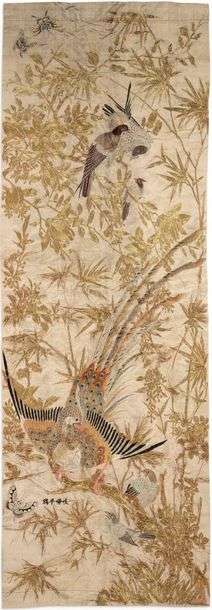 Ensemble de deux panneaux verticaux en soie, brodés aux fils dorés et polychromes, l'un à fond crème, figurant un paon et plusieurs oiseaux parmi bambous et magnolia | l'autre, à fond vert pâle, représentant un couple de hérons et des oiseaux, parmi roseaux et pivoines.