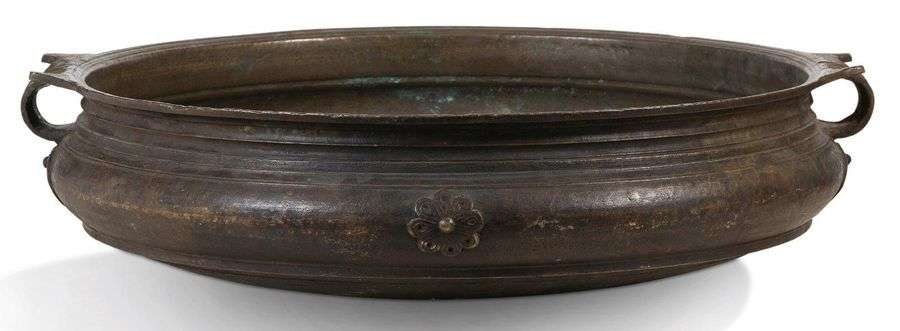 Important urli en bronze, le pourtour à motifs d'anneaux, la panse bombée ornée de fleurs en relief, deux anses galbées complétant l'ensemble.