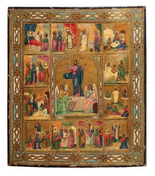 ICÔNE, RUSSIE, FIN DU XIXE SIÈCLE La Résurrection entourée des douze faite