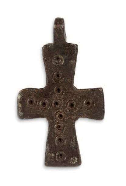CROIX BYZANTINE, XIIIE SIÈCLE en bronze à patine brune à décor bouleté 4,5