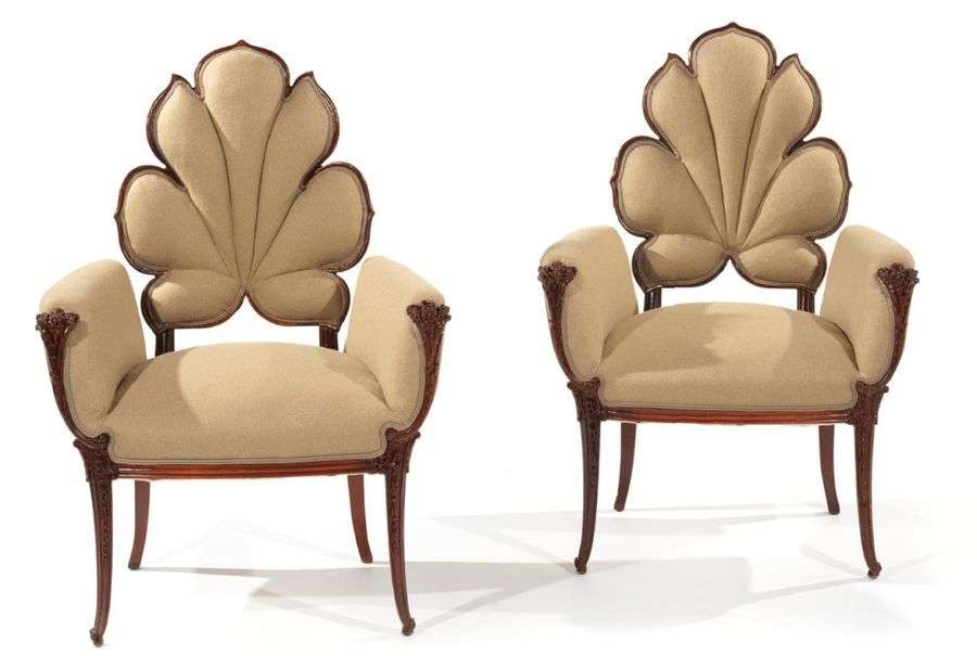 PAIRE DE FAUTEUILS En acajou verni, à dossier découpé en forme de feuille, accotoirs légèrement galbés à façade finement sculptée d'un motif floral| reposant sur des pieds sabre. Assise et dossier recouverts postérieurement d'un lainage marron glacé. Circa 1900.