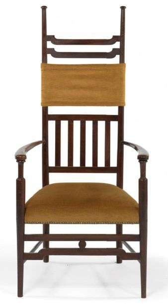 FAUTEUIL EN ACAJOU À haut dossier droit formé de deux montants se prolongeant en piétement arrière, reliés par un bandeau de tissu et des barreaux verticaux. Accotoirs légèrement arqués soutenus à l'avant par des pieds effilés.