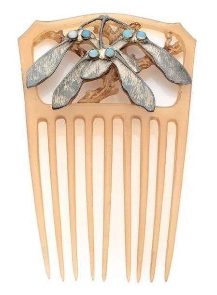 GRAND PEIGNE ART NOUVEAU EN CORNE BLONDE Barrette ajourée à décor végétal stylisé de feuilles d'érable en argent, agrémentées de six cabochons d'opale serties. Signé " L. Gaillard ".