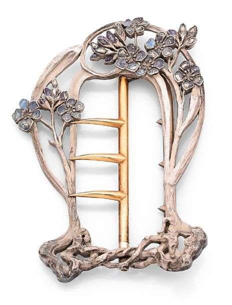 BOUCLE DE CEINTURE En argent et émail, à décor ouvragé de fleurs de myosotis mauves. Fermoir à trois griffes en métal, dans la partie ajourée. Signée " Lalique ".