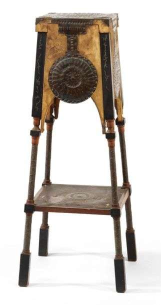 HAUTE SELLETTE En bois noirci, gainée de parchemin et ornée de disques de cuivre repoussé et martelé| pieds en noyer ciselés formant colonnette, reliés par une tablette d'entretoise, soulignés en partie médiane d'une feuille de cuivre enroulée et d'un décor en marqueterie d'os| reposant sur de hauts sabots à profil rectangulaire. Circa 1900.