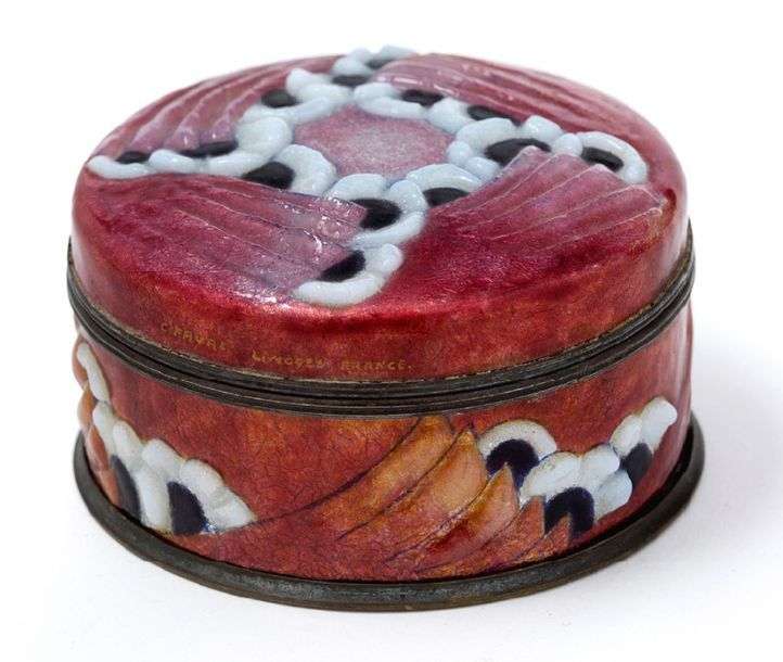 BONBONNIÈRE Décor émaillé en relief de fleurs et d'ailettes, émaux lie-de-vin, blanc laiteux et noir. Base et cerclage en laiton oxydé. Signature dorée " C. Fauré
