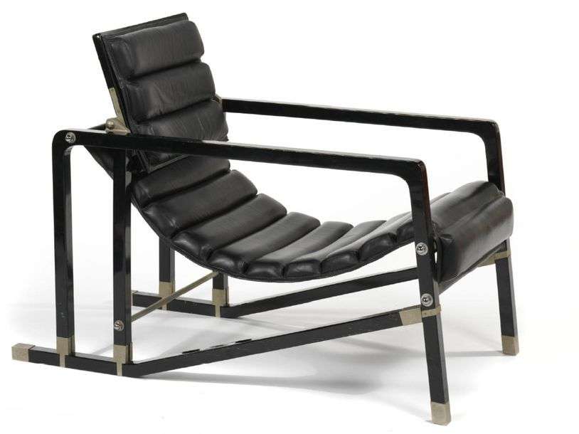 FAUTEUIL TRANSAT En hêtre laqué noir, fixations et sabots en laiton chromé, assise suspendue gainée de cuir noir, appui-tête mobile.
