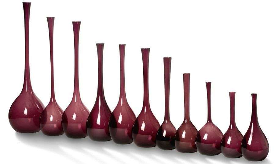 A set of eleven purple blown glass vases by Arthur Percy for Gullaskruff 8 1/8 to 19 1/8 in.