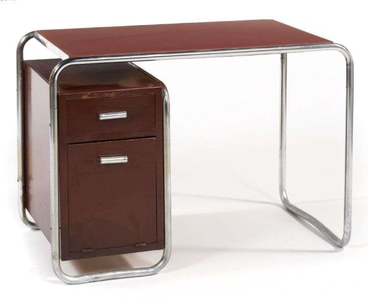 PETIT BUREAU DE DAME À structure tubulaire en métal chromé, plateau rectangulaire en verre laqué, caisson ouvrant à un tiroir et un classeur basculant, en bois laqué prune. Modèle S285/2. Editeur Thonet.