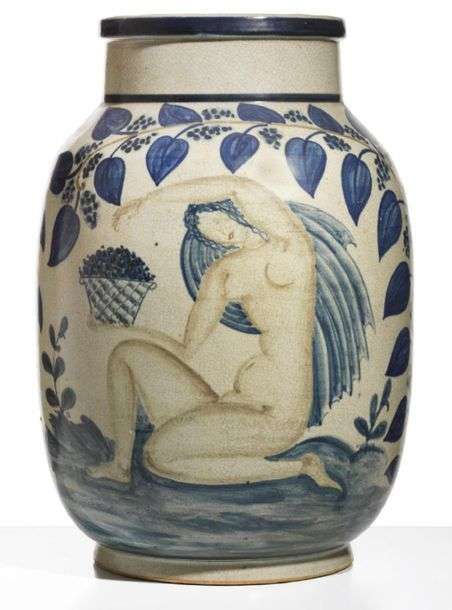 GRAND VASE Corps ovoïde sur talon en faïence, émaux bleu et gris sur fond beige craquelé, à décor de deux jeunes femmes et de feuillages. Signature des initiales de l'artiste au revers de la base. Circa 1928.