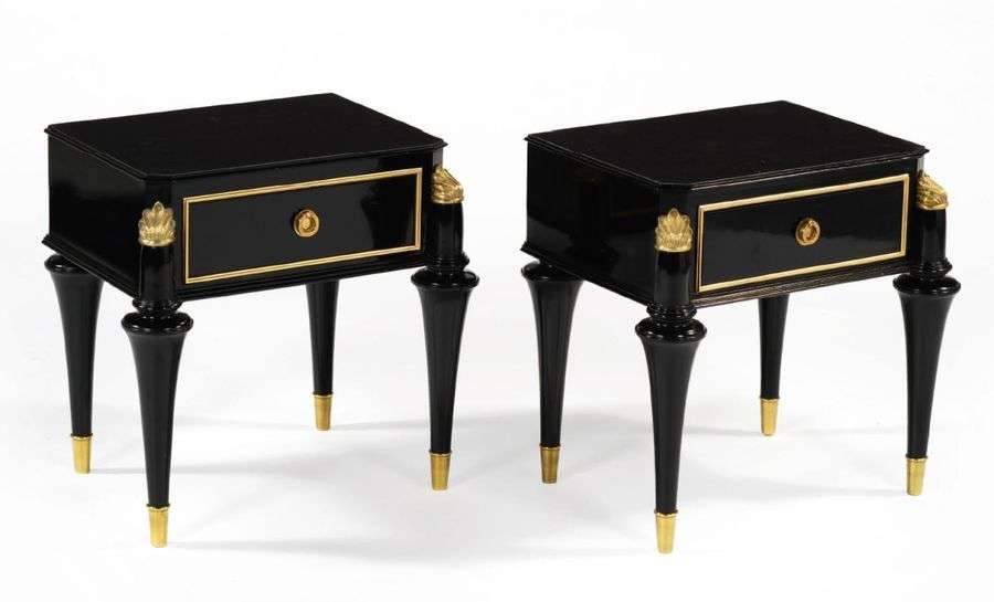 PAIRE DE BOUTS DE CANAPÉ En bois laqué noir, ouvrant à un tiroir, pieds avant surmontés de palmette en bronze, sabots et prise en laiton doré. Circa 1960.