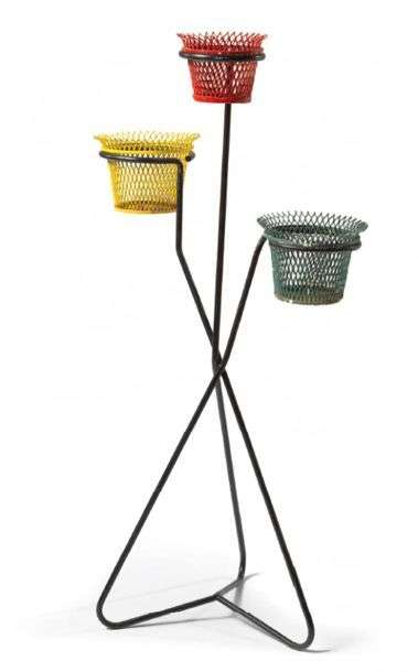 PORTE-PLANTES En métal tubulaire laqué noir, bras coudé formant triangle accueillant à chaque extrémité des cache-pots en treillis de métal laqué. Circa 1955.