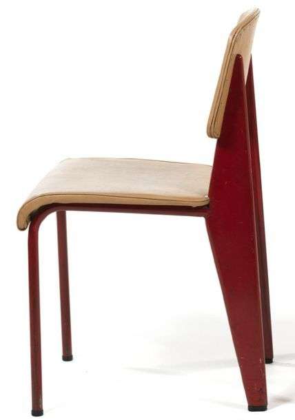 Piètement en tôle d'acier pliée laquée rouge, assise et dossier en contreplaqué moulé recouverts de skaï ivoire. Circa 1952.