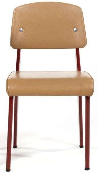 Piètement en tôle d'acier pliée laquée rouge, assise et dossier en contreplaqué moulé recouverts de skaï ivoire. Circa 1952