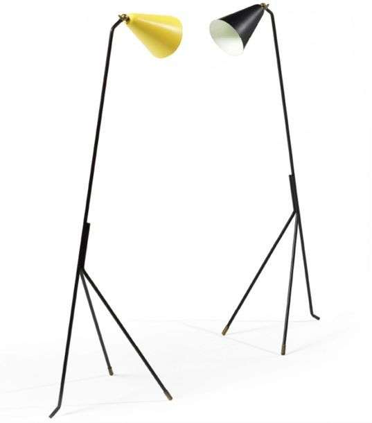 ENSEMBLE DE DEUX LAMPADAIRES Piètement en métal tubulaire laqué noir, déflecteur conique en tôle de métal laquée jaune ou noir. Circa 1950.