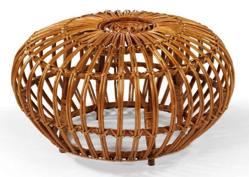 GRAND TABOURET EN ROTIN De forme sphérique, à motif rayonnant formé de tiges de bambou et reposant sur quatre pieds centraux. Circa 1960.