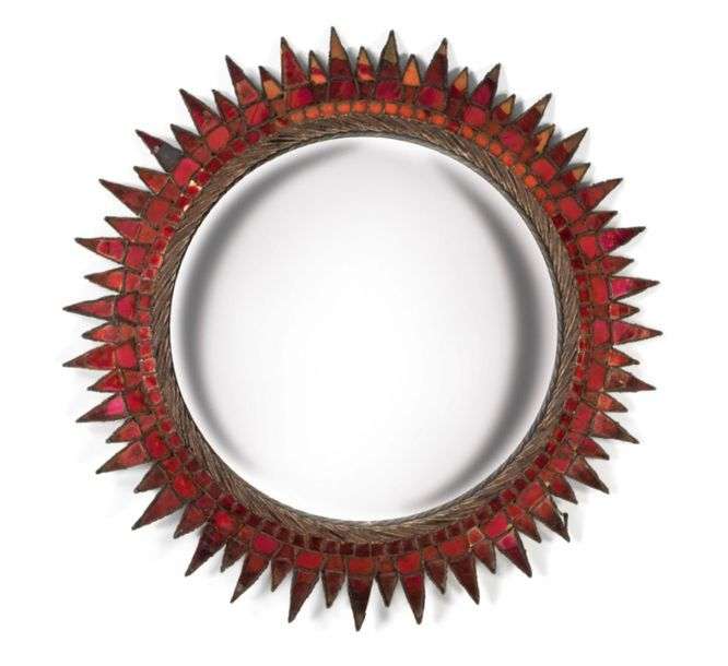 En talosel noir, présentant une double rangée de rayons incrustés de verre irisé rouge cerise, miroir sorcière au centre. Signé Line Vautrin au dos.