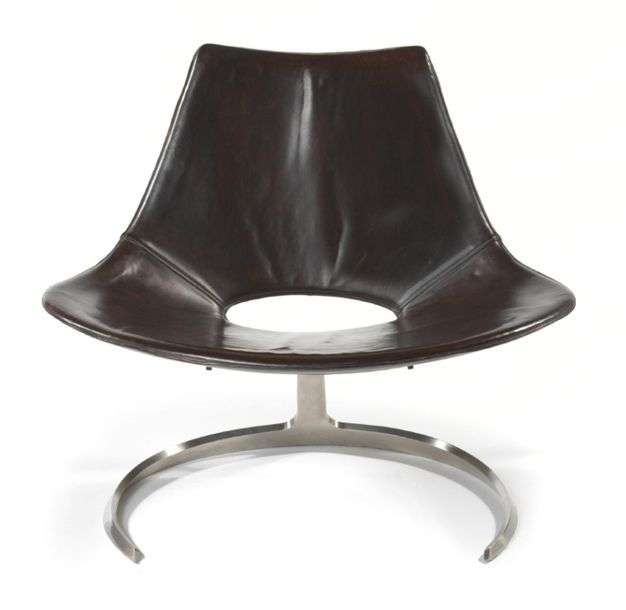 Structure du piètement en acier inoxydable, formant un arc de cercle à la base, coque d'assise baquet en bois thermoformé, gainée de cuir brun foncé, présentant une ouverture dans le bas du dossier. Estampille au fer de l'éditeur Ivan Schlechter dans le cuir au revers de l'assise. Circa 1965.