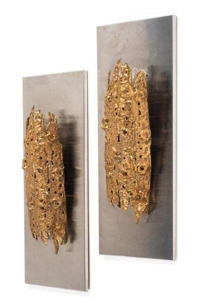 PAIRE DE GRANDES APPLIQUES Platine de fixation rectangulaire en aluminium brossé, accueillant des sculptures bombées en bronze doré dissimulant deux lumières.