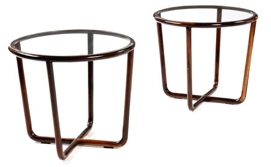 PAIRE DE BOUTS DE CANAPÉ Structure en palissandre, piètement tubulaire cruciforme soutenant un plateau circulaire en verre.