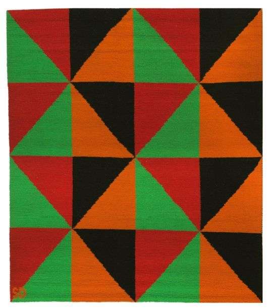 TZARA Tapisserie en laine polychrome, à décor cinétique de triangles formant des carrés. Signée du monogramme de l'artiste dans la trame, en bas à gauche.