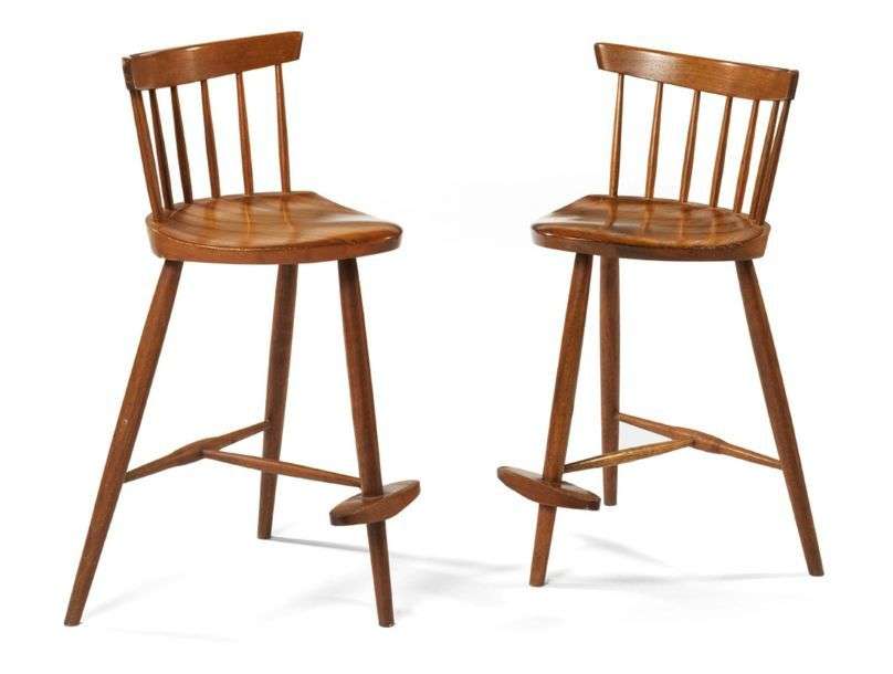 En noyer, reposant sur trois pieds reliés par une entretoise en T, dossier bas légèrement galbé à barreaux verticaux.