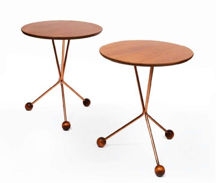 DEUX PETITS GUERIDONS Plateau circulaire en teck, reposant sur trois pieds en tube de cuivre coudé, à réception de sphères en bois.