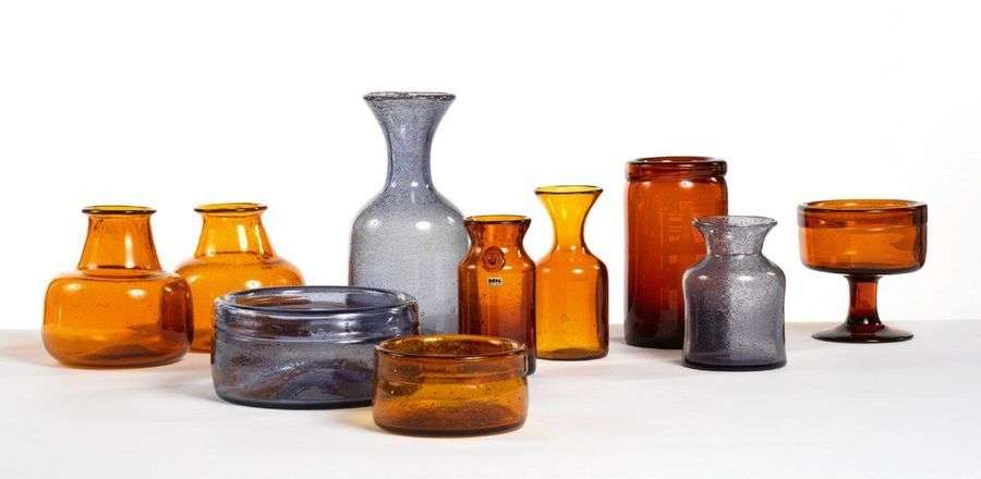 ENSEMBLE DE DIX PIÈCES EN VERRE SOUFFLÉ BLEU ET ORANGE Comprenant : sept vases, une coupe sur pied et deux vide-poches.