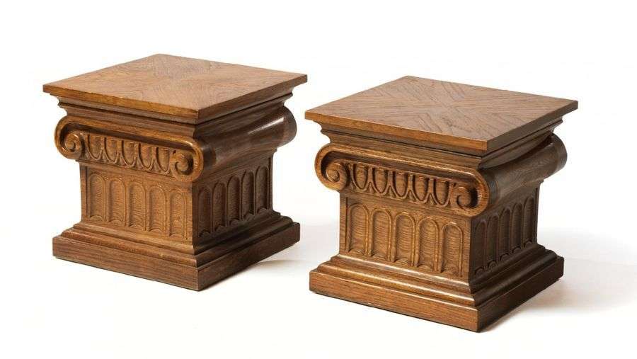 PAIRE DE BOUTS DE CANAPÉ Base en bois en forme de chapiteau de colonne ionique, plateau carré