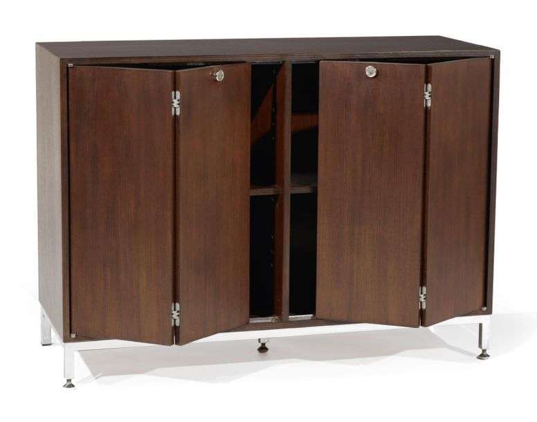 PETIT MEUBLE DE RANGEMENT A portes " papillon ", découvrant un intérieur aménagé de quatre compartiments| structure en placage de palissandre reposant sur un piètement en métal chromé.