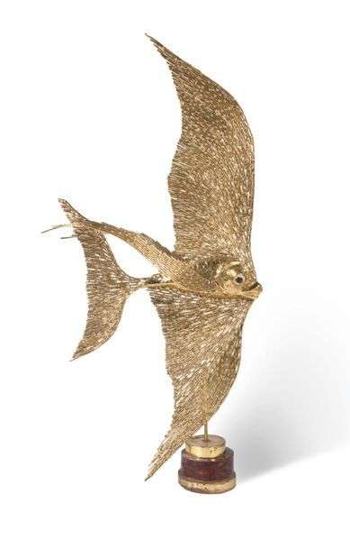 A large sculpture in gilded brass symbolizing a tropical fish.