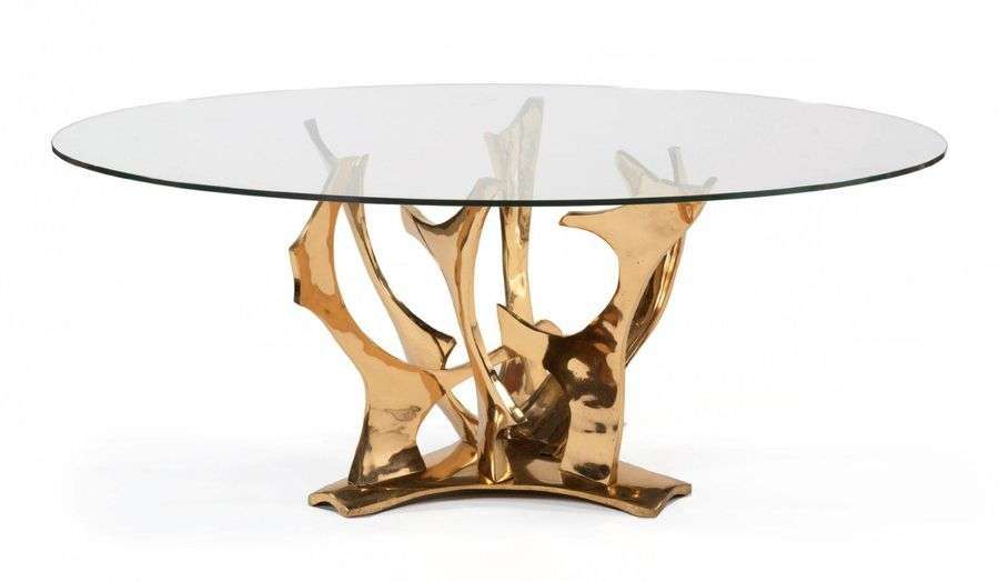 TABLE Pied central en bronze doré symbolisant un décor marin, soutenant une dalle de verre ovale.
