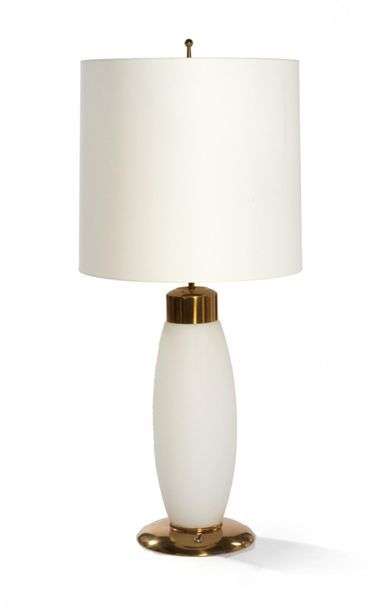 IMPORTANTE LAMPE En laiton et verre opalin blanc, reposant sur une base circulaire.